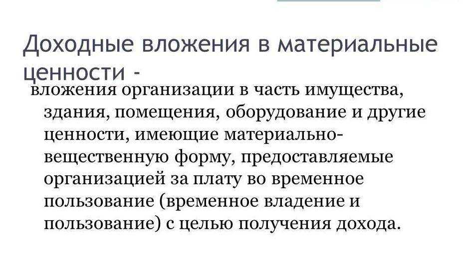 Доходные вложения (ДВ) в материальные ценности – это инвестиции компании в оборудование, различные объекты, ценности, недвижимость. Они отличаются двумя основными признаками: