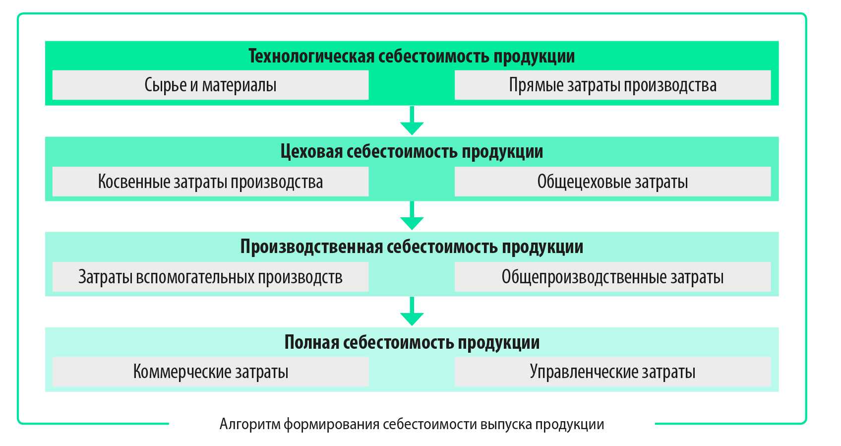 В то же время можно вывести общий алгоритм формирования себестоимости выпуска продукции, который определяет самый верхний уровень затрат (см. рисунок).