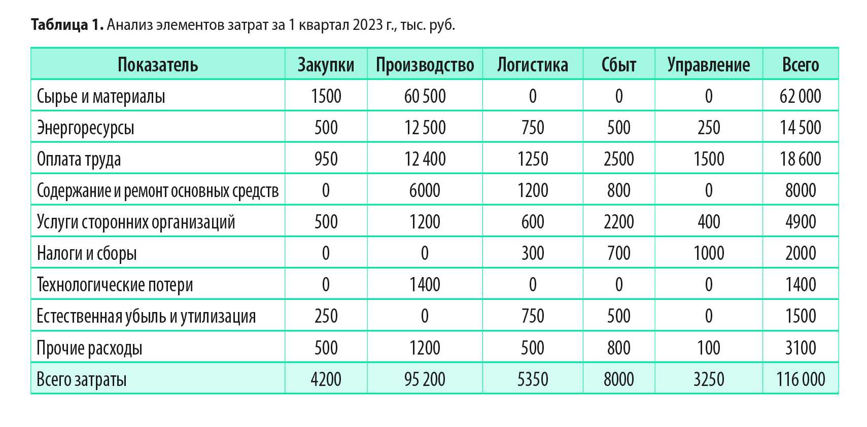 В таблице 1 приведен пример группировки затрат производственной компании «Наша марка» в аналитике по элементам затрат и бизнес-процессам.
