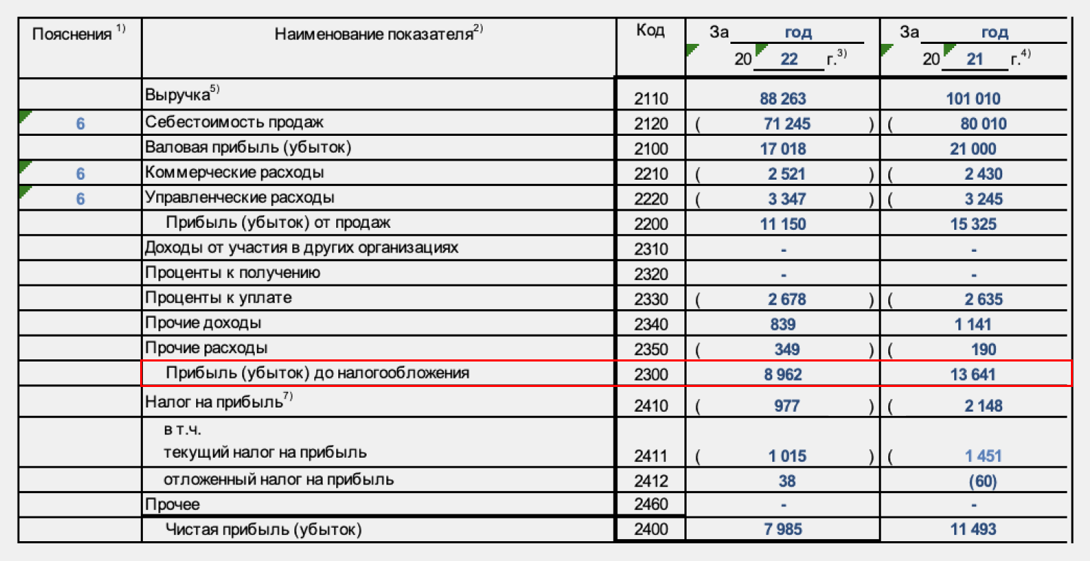 - Строка 2300 формы 2 — прибыль до налогообложения, отражённая в отчёте о финансовых результатах.