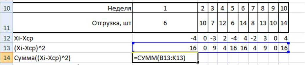 Разложим формулу на составные части и рассчитаем среднеквадратическое отклонение в Excel на примере нашего временного ряда.