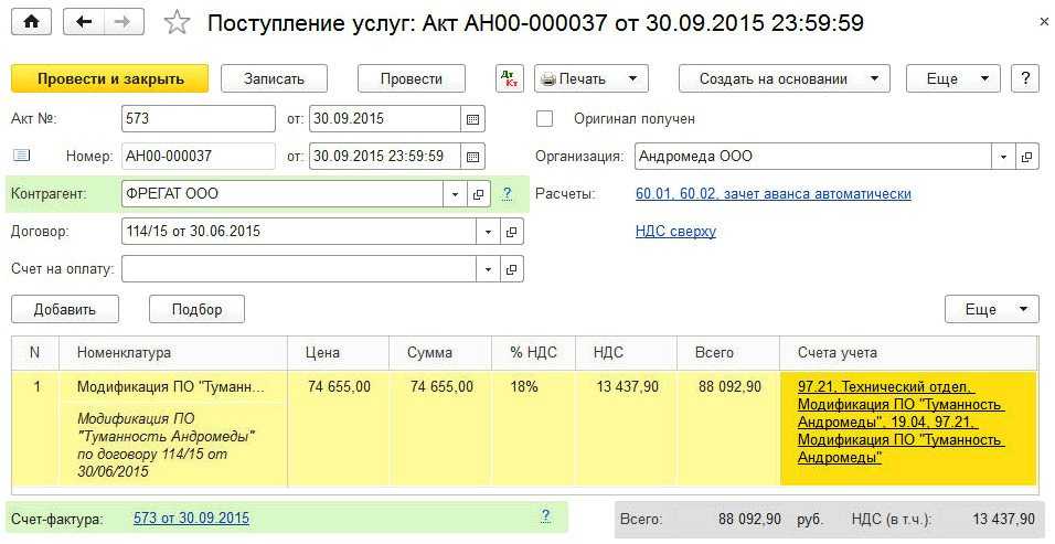 В связи с производственной необходимостью ООО «Андромеда» заключило договор со сторонней организацией на модификацию программного обеспечения «Туманность Андромеды», учитываемого организацией в составе НМА. В сентябре 2015 года работы по модификации были приняты. Стоимость работ составила 88 092,90 руб. (в т.ч. НДС — 18 %). Учетной политикой организации определено, что расходы на модификацию для целей бухгалтерского и налогового учета будут признаваться равномерно в течение срока полезного использования программного продукта. |