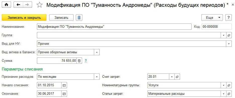 - наименование расхода будущих периодов — Модификация ПО «Туманность Андромеды» (выбирается из справочника Расходы будущих периодов);