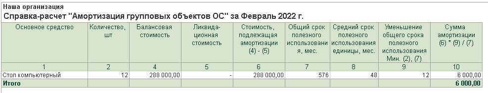 Доля амортизации, приходящаяся на один компьютерный стол, составляет 500 руб. в месяц (6 000 руб. / 12 шт.).