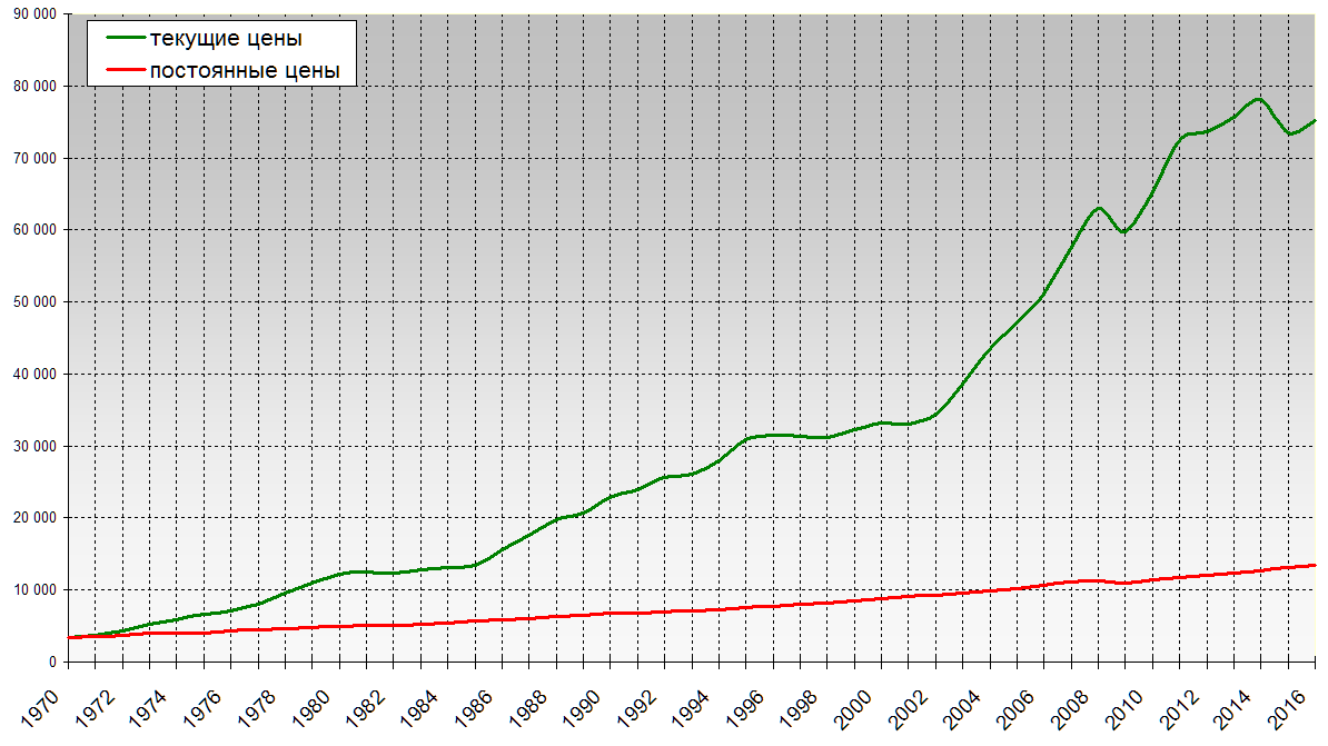 Номинальный ВВП в 2017 г. в России составлял 1,469 млрд. долларов США, а реальный — 4000 млрд. долларов США.