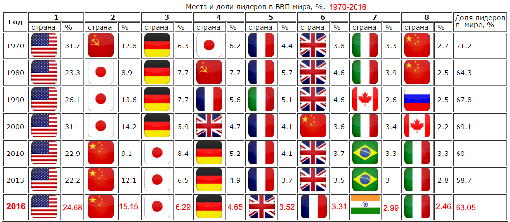 - США, чье лидерство постоянно пытается оспорить Китай. ВВП равно 18 триллиона триллионов долларов США. Американская нацвалюта признана одной из самых стабильных в мире, что и обеспечивает успешное развитие экономики и получение каждый год высокого ВВП. Ежегодный рост ВВП равен 2,2%, а доход на одного человека составляет — 55 тыс. долларов США.,