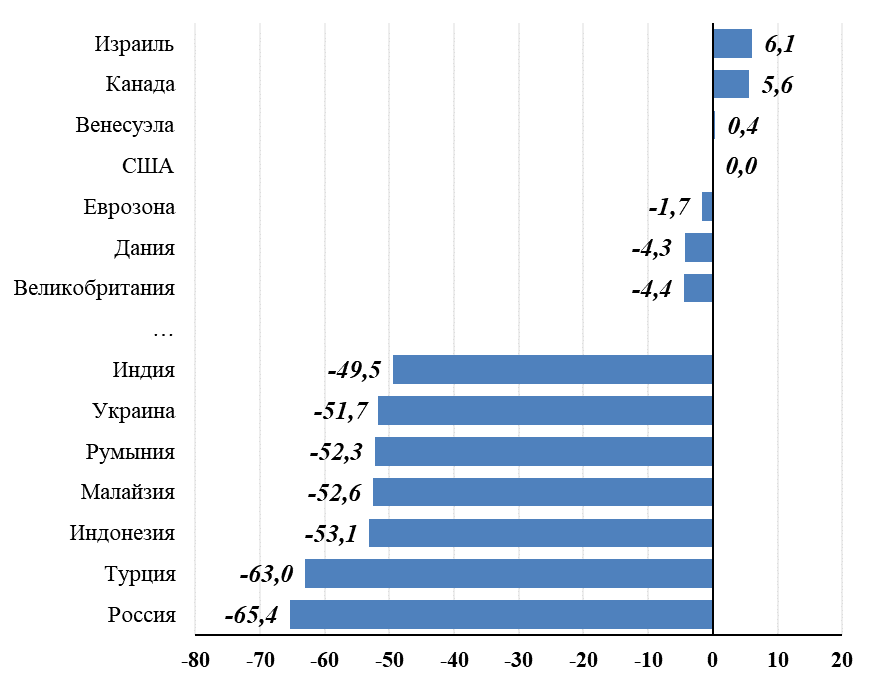 Индекс Биг Мака за январь 2022 года, в процентах к цене в США