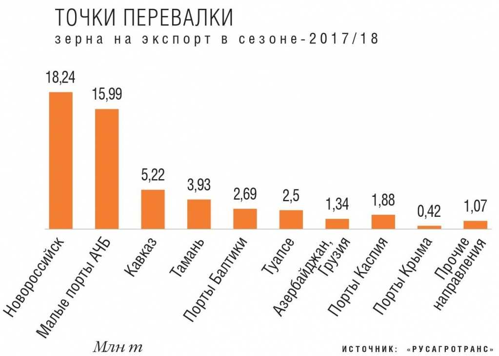 По предварительной оценке аналитического центра «Русагротранса», экспорт зерна из России в сезоне-2017/18 составил рекордные 53,3 млн т против 35,5 млн т в 2016/17 сельхозгоду. А с учетом зернобобовых (1,36 млн т), муки (0,35 млн т) и вывоза в страны ЕАЭС (0,98 млн т) общий объем поставок за рубеж оценивается почти в 56 млн т против 37 млн т годом ранее.