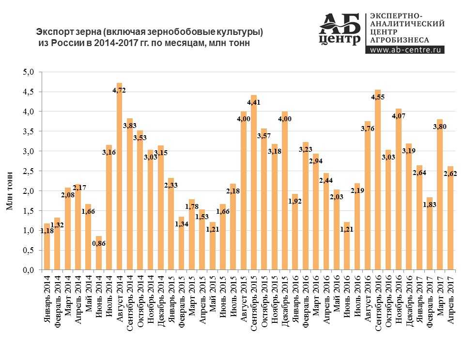 В 2017 году наблюдается дальнейшее увеличение объема поставок зерна за рубеж. Так, в январе-апреле 2017 года, суммарный объем экспорта достиг 10 892,5 тыс. тонн, что на 3,4% или на 362,6 тыс. тонн больше, чем в январе-апреле 2016 года и на 56,0% или на 3 910,4 тыс. тонн больше, чем за аналогичный период 2015 года.