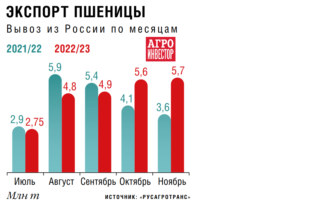 В среднем ежемесячно вывозилось около 4,44 млн т основных зерновых агрокультур, в то время как в 2016/17-м этот показатель составлял около 3 млн т. Пять раз — в сентябре, ноябре, декабре, марте и апреле — был достигнут и превышен уровень в 5 млн т. Самый большой объем был отгружен на внешние рынки в ноябре — более 5,5 млн т.