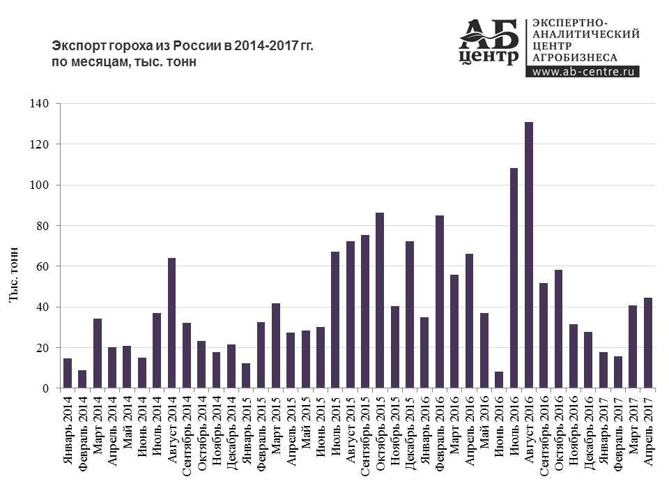 Экспорт гороха из России в 2017 году, за период с января по апрель, составил 118,4 тыс. тонн. Снижение по отношению к аналогичному периоду 2016 года составило 51,1% или 123,6 тыс. тонн, однако к январю-апрелю 2015 года объем экспорта вырос на 4,1% (на 4,6 тыс. тонн).
