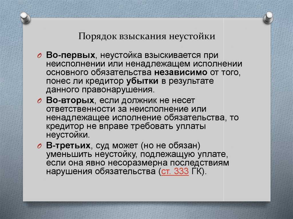 Важно: если должник не несет ответственности за неисполнение или ненадлежащее исполнение обязательства, то кредитор не вправе требовать уплаты неустойки ( ГК РФ). Получается, что в иных случаях должник обязан уплатить неустойку даже при отсутствии у кредитора прямых убытков, обусловленных действиями должника