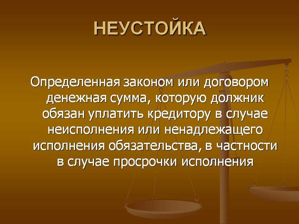 Понятие «неустойка» раскрыто в ГК РФ. Это определенная законом или договором денежная сумма, которую должник обязан уплатить кредитору в случае неисполнения или ненадлежащего исполнения обязательства, в частности в случае просрочки исполнения. Причем по требованию об уплате неустойки кредитор не обязан доказывать причинение ему убытков.
