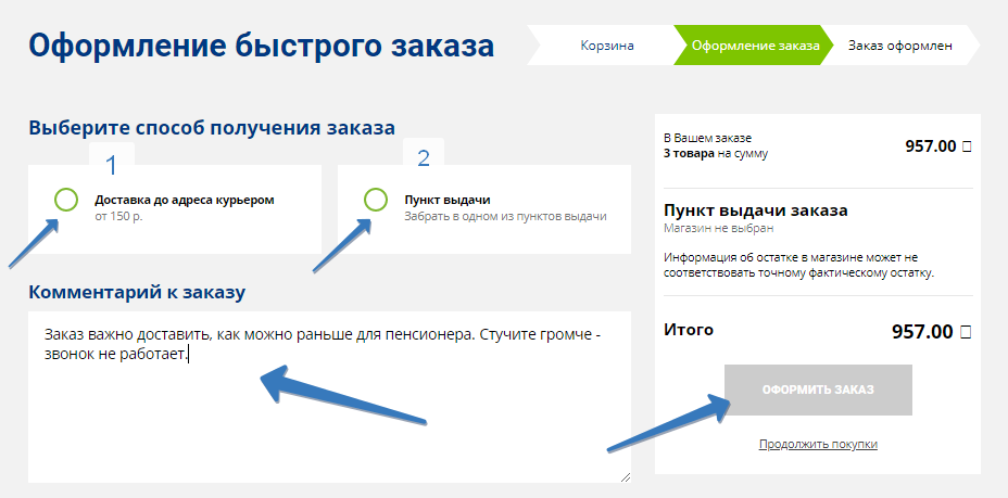 После выбора способа доставки выберите из выпадающего списка подходящий адрес или пункт. Далее напишите комментарии при необходимости (смотрите на картинке) и нажмите “Оформить заказ” (справа).