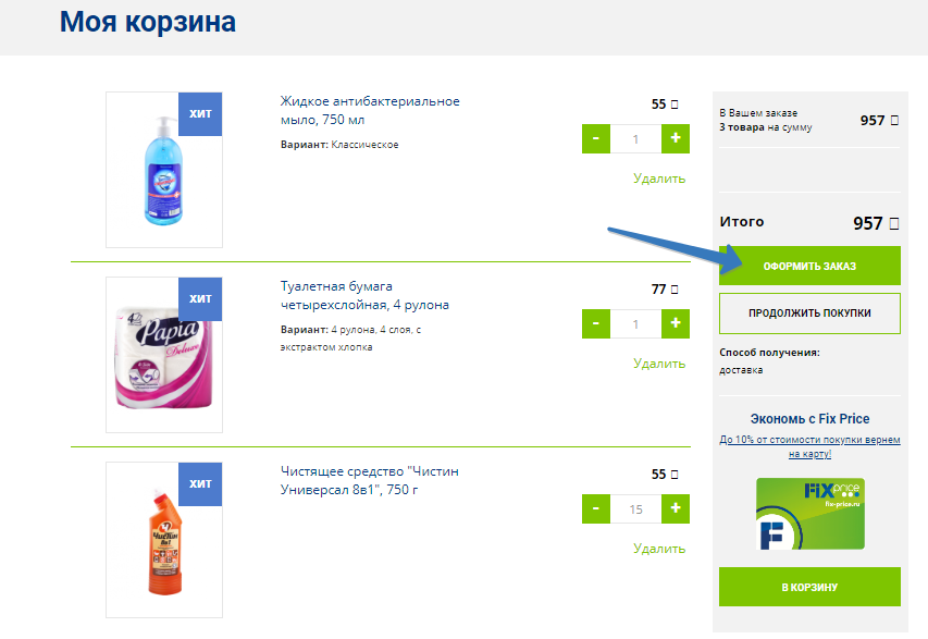 После наполнения корзины перейдите во вкладку Корзина (указана стрелкой на рисунке). Оказавшись в корзине вы можете отредактировать заказ – добавить или убавить количество. Вы можете добавить в корзину бонусную Карту Fix Price за 55 рублей и экономить, если еще не обзавелись картой. Нажмите “Оформить заказ”, если с корзиной все в порядке.