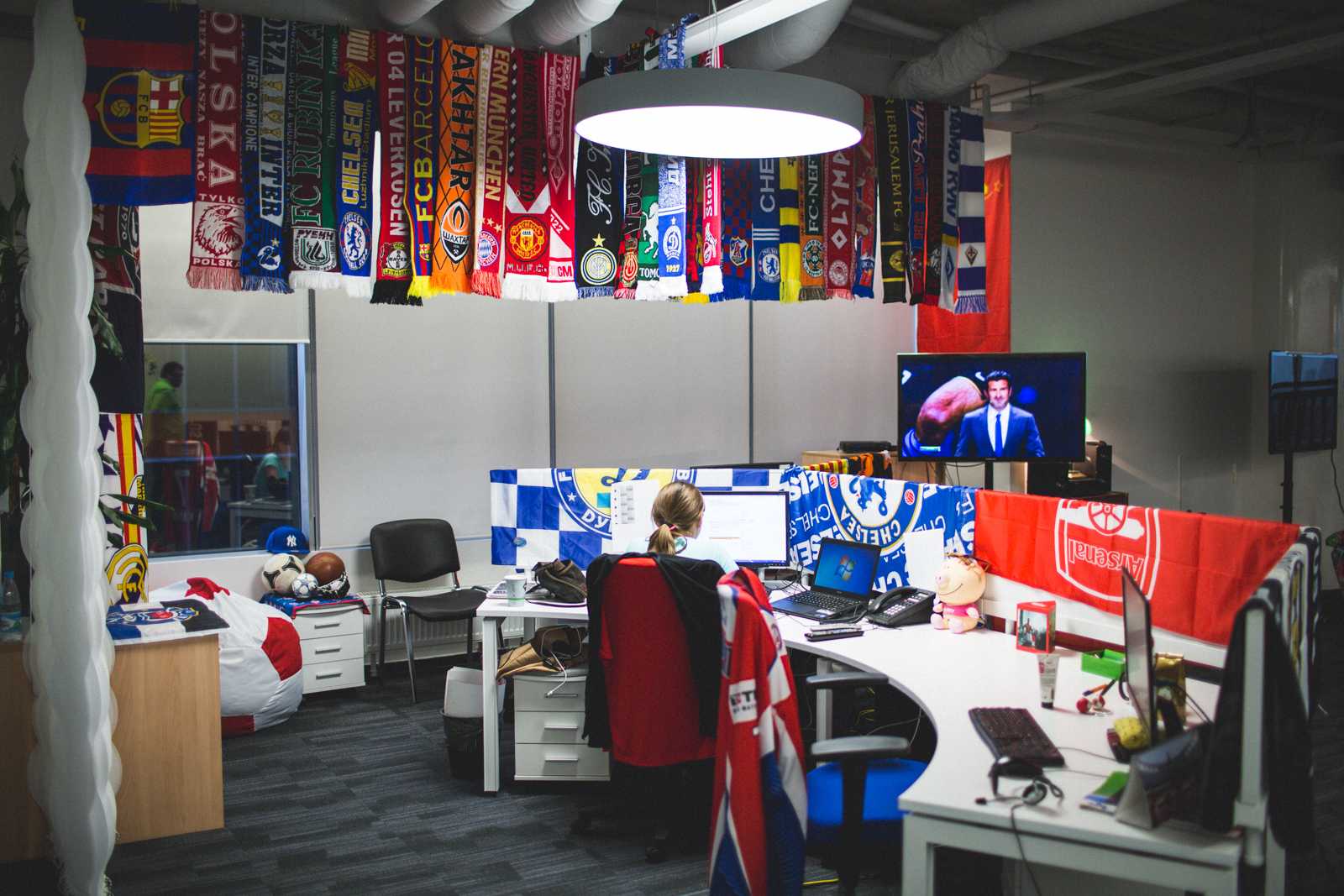 Все сотрудники работают в просторном оупенспейсе: стеклянными стенами отделены лишь переговорки и кабинеты руководителей.