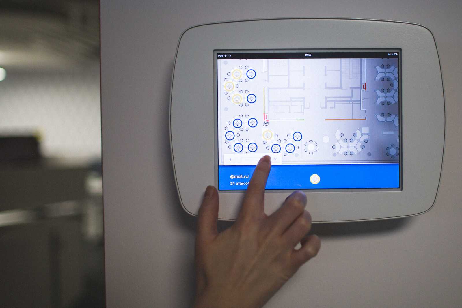 В рабочих зонах столы объединены в кластеры-ромашки. Столы стоят таким образом, чтобы, во-первых, сотрудникам было удобно обсуждать рабочие вопросы с коллегами, а во-вторых, чтобы у каждого был вид на Москву. На всех этажах есть мобильные кабинеты, где можно собраться командой — например, на планерку или брейншторм.