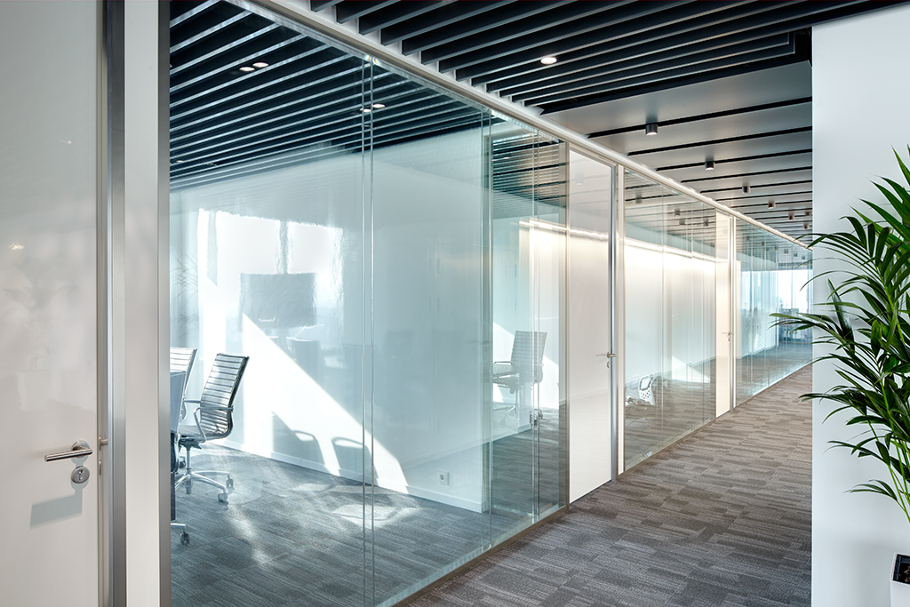 В оформлении повсеместно используются стекло и белый цвет. Глянцевые стены в офисе, а также колонны и дверцы шкафов можно использовать в качестве доски для пометок маркером или магнитных креплений.