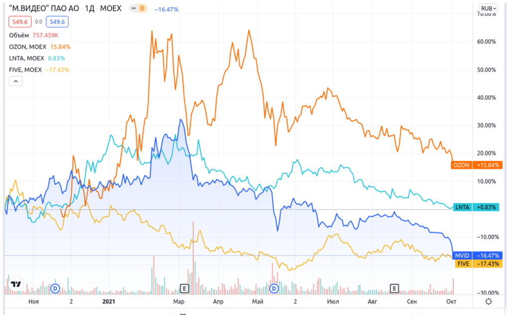 Сравнил «Озон», «Ленту», «X5» и «М.Видео». Пока по итогам года в плюсах только акции OZON и чисто номинально Лента.