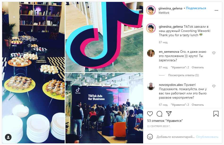 Скриншот коллажа пользователя ginesina_gelena, который делится новостями об открытии нового офиса в их коворкинге