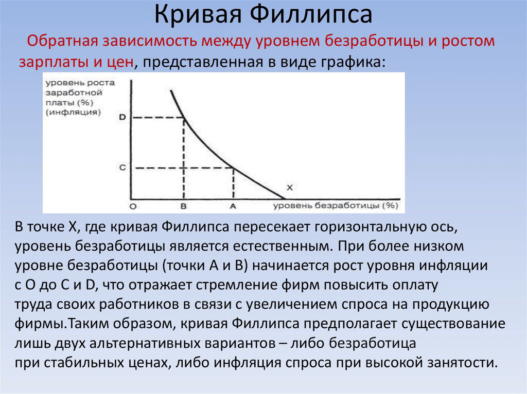 Экономистами давно замечена связь инфляции и безработицы. Наглядно её изобразил учёный Албан Уильям Филлипс. Он проанализировал суммы оплаты труда в Великобритании в 1861-1958 годы и обнаружил обратную связь между уровнем безработицы и скоростью роста зарплат. Впоследствии показатель зарплат был заменён инфляцией, поскольку рост оплаты труда во многом зависит от скорости увеличения цен изготавливаемой продукции.