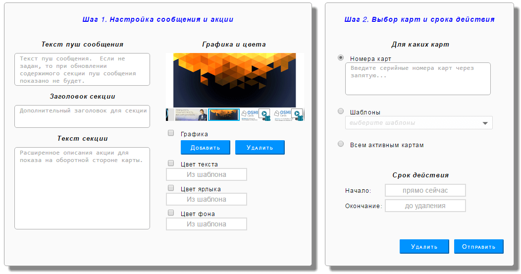 Формат push-сообщений позволяет отправлять сообщения без привязки к полям карты — это значит, что на карте отображаться текст сообщения не будет. Уведомление может быть отправлено как сразу, так и в определенный день и время.