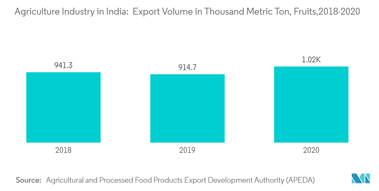 По данным APEDA, в 2020–2021 годах Индия экспортировала фруктов и овощей на сумму 1 342,14 млн долларов США, в том числе фруктов на 674,53 млн долларов США и овощей на 667,61 млн долларов США.