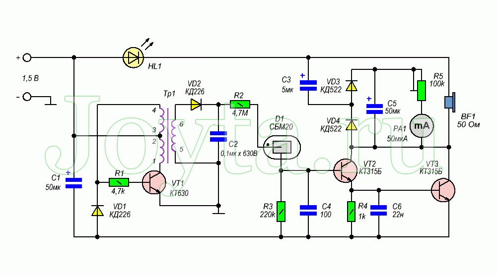 Повышающий преобразователь дозиметра – не что иное как простой блокинг-генератор. Появляющиеся импульсы высокого напряжения на вторичной обмотке (выводы 5 – 6) трансформатора Тр1, выпрямляются диодом VD2. Данный диод должен быть высокочастотным, поскольку импульсы достаточно короткие и имеют высокую частоту следования.