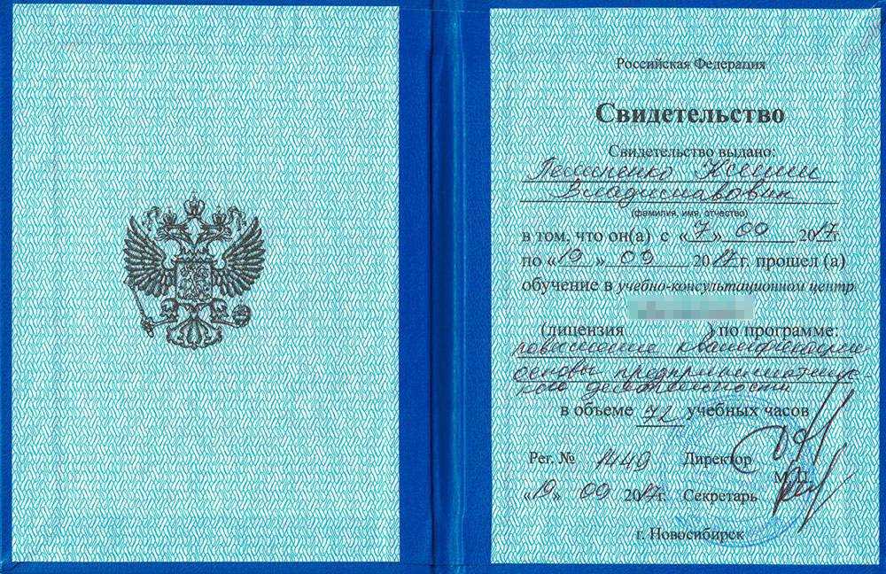 Мое свидетельство о прохождении курсов. Я не знаю, почему там написано Новосибирск
