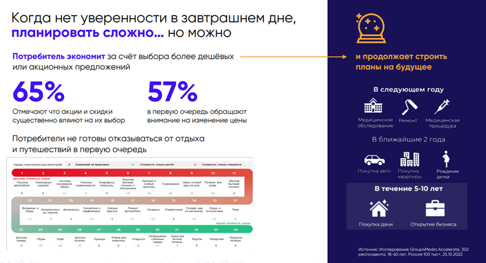 Как рассказала директор по клиентскому сервису digital-агентства «Риалвеб» Светлана Ширяева, потребители стали гораздо более экономными, однако это не повод прогнозировать снижение продаж в туризме, а только один из факторов, на которых стоит делать акцент в продвижении. «Аудитория в целом стала более бережно относиться к своим сбережениям и тратам. Более 50% респондентов заявляют, что их доход по итогам прошлого года снизился. Это, безусловно, влияет на потребительскую активность наших потенциальных клиентов. В то же время наша аудитория не готова ставить жизнь на паузу. Все по-прежнему продолжают планировать покупку недвижимости, автомобиля, большая часть аудитории не готова отказываться от путешествий, перелетов», — отмечает она. Зная это, свой продукт можно продвигать через различные программы лояльности, акции, скидки, подчеркивая, что вы помогаете людям сэкономить. В пример эксперт привела успешные кейсы из сферы недвижимости. Сейчас застройщики начали предлагать потенциальным клиентам заметные скидки, подарочные карты с квадратными метрами, накопительные программы и т.д