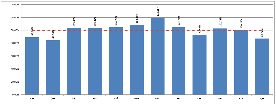 Кроме этого, на продажи будут влиять и индексы сезонности, которые представлены на графике ниже: