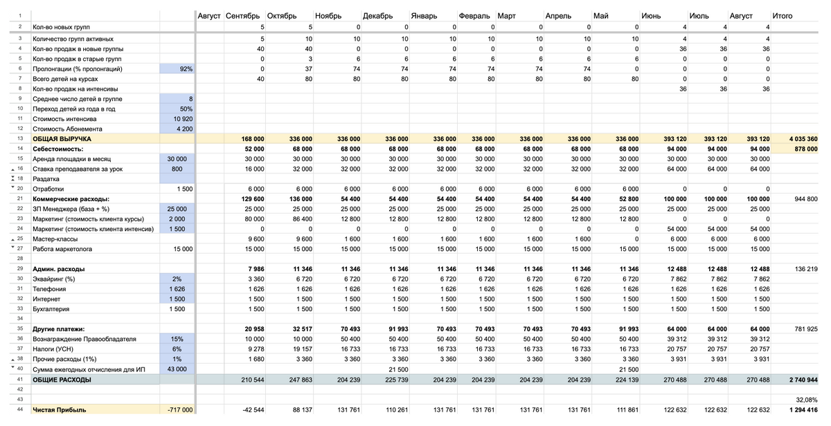 Я продавала полуторачасовые занятия абонементами: на 4, 14 или 28 уроков — такой формат установила управляющая компания. Всего в учебном году было 28 занятий по выходным, после которых следовали летние интенсивы — они оплачивались отдельно. Также была возможность купить одно занятие.