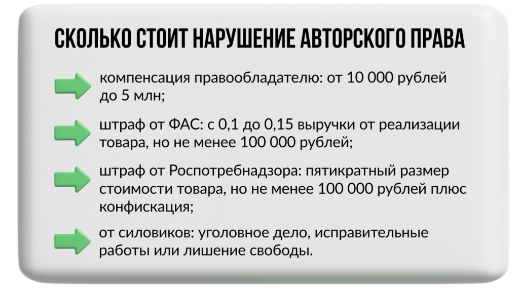У каждого героя мультфильма/кинофильма и у самого мультфильма/кинофильма есть правообладатель, с которым необходимо согласовывать условия использования персонажа. Даже если мультик был снят при коммунизме  в СССР. В 2020 году «Союзмультфильм» получил исключительную лицензию на золотую коллекцию советской анимации. С тех пор компания судится с предпринимателями, в основном с малым бизнесом и ИП. По закону, компенсация правообладателю может доходить до 5 млн рублей. Но судьи все-таки применяют здравый смысл и редко назначают большие выплаты. Сколько и не требуют: чаще речь идет о 100 000, может 150 000 рублей, что тоже весьма неприятно.