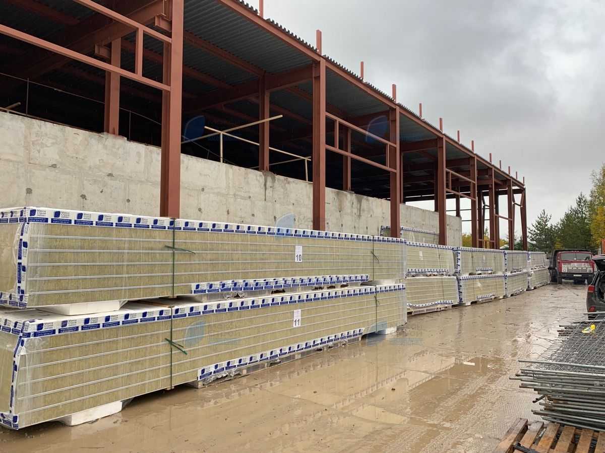 Выполненные работы: Раскладка сэндвич панелей по проекту заказчика, поставка стеновых сэндвич-панелей с наполнителем минеральная вата, поставка фасонных элементов