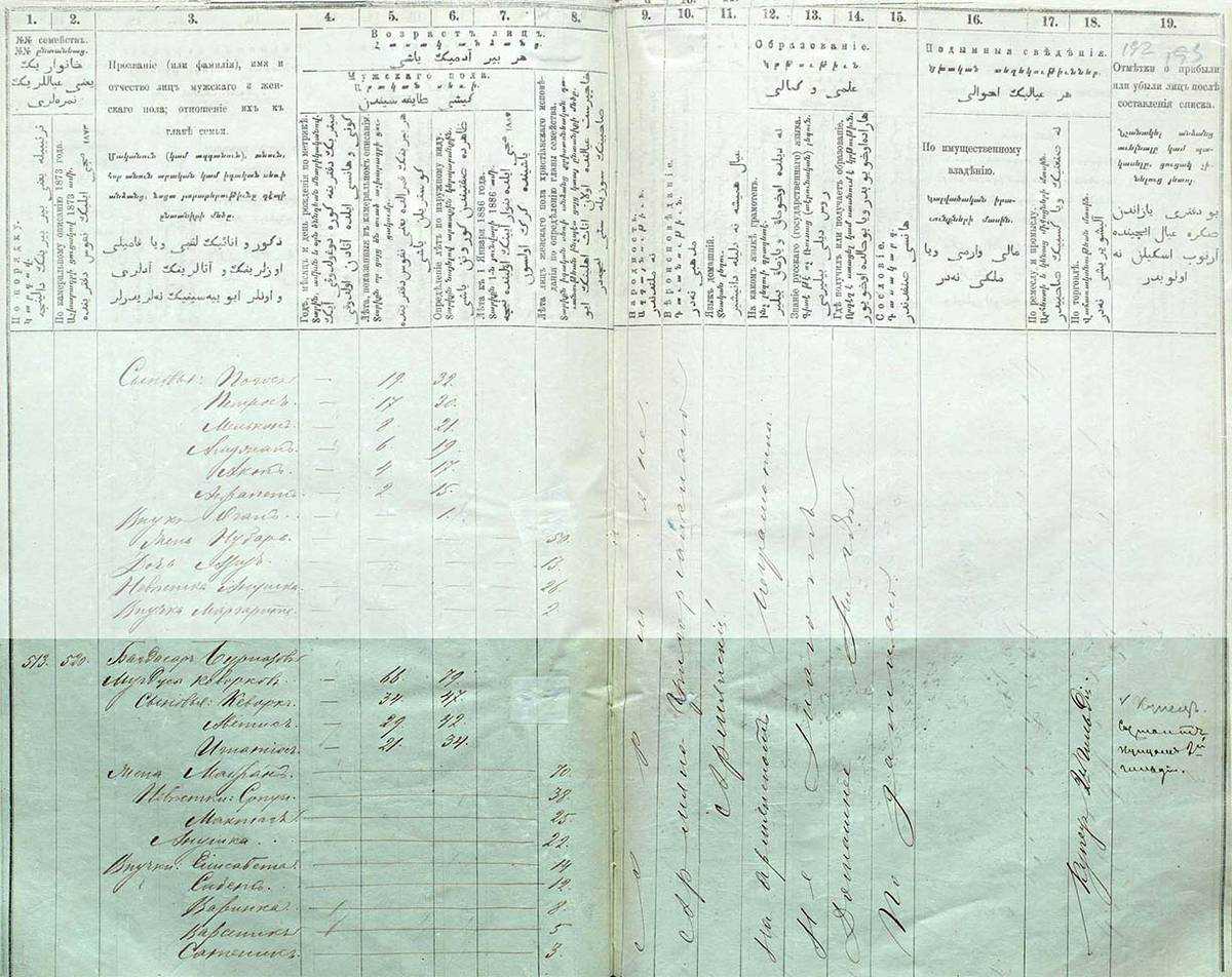 Так, по другой моей линии Ереванский архив прислал список 1886 года из города Ново-Баязета Эриванской губернии, где указан мой прапрадед, его жена и родители. Поскольку в губернии было много туземного населения — армян и татар, все графы продублированы на их родных языках.