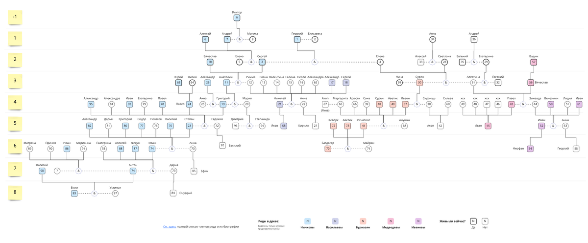 Miro — это такая виртуальная доска, где удобно рисовать свое генеалогическое древо. Там я отмечал родственные связи, имя, пол, обозначал, к какой линии относится человек и жив ли он сейчас.