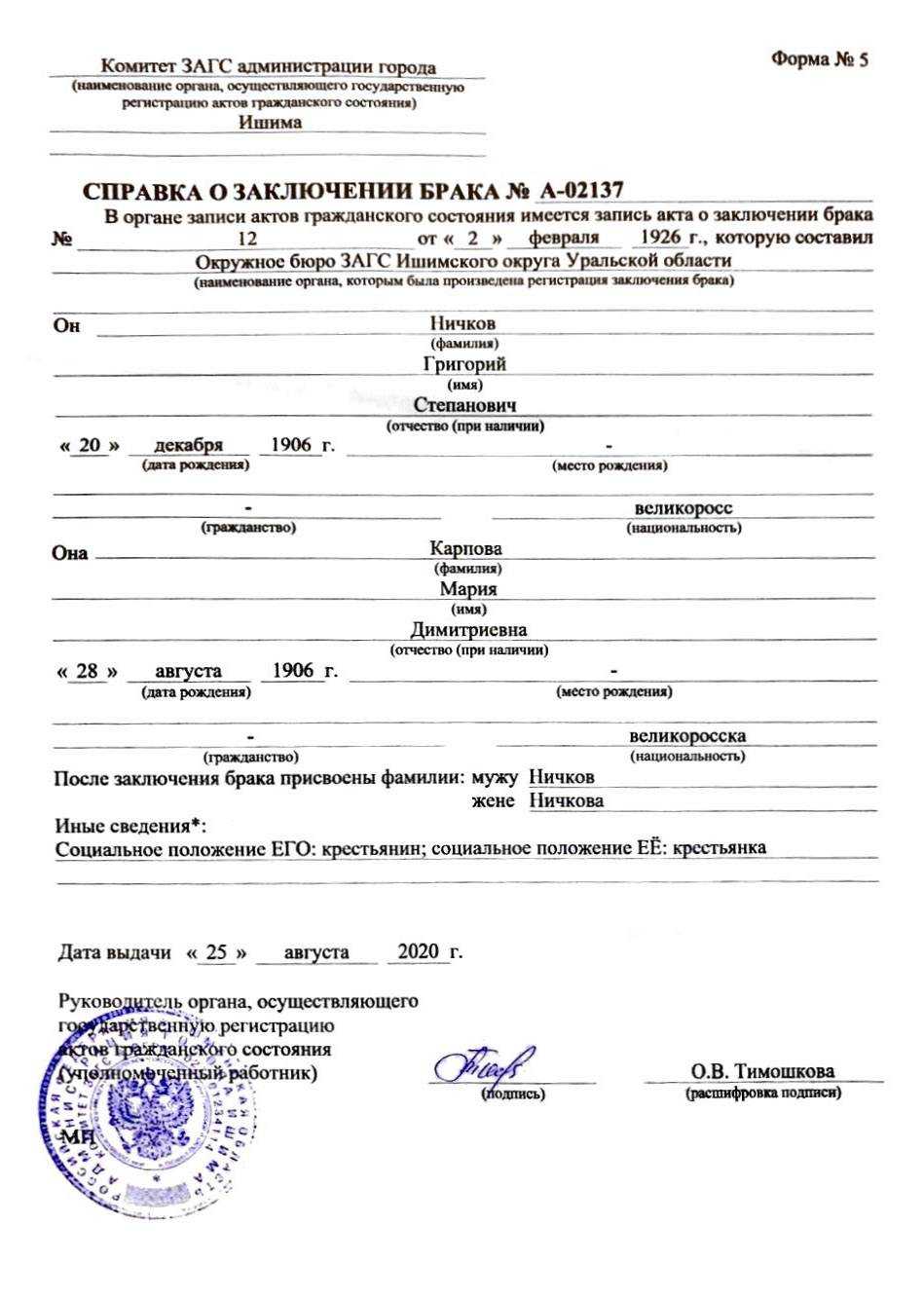 Цепочка, отделяющая вас от предка, может быть длинной, поэтому надо представить оригиналы свидетельств или справок о рождении всех в этой цепочке. Например, чтобы получить справку о браке прапрадеда, я принес свое свидетельство о рождении, документы о рождении моего отца, деда и прадеда, а также справку о смерти последнего.