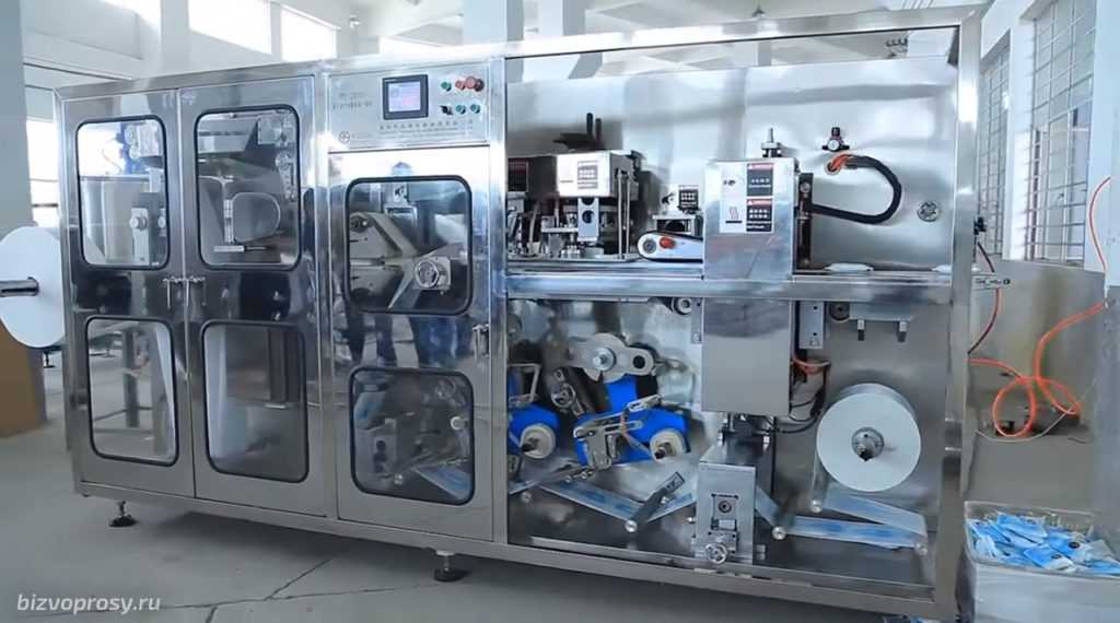 Оборудование обойдется примерно в 2 млн. рублей, в зависимости от мощности линии. Данный станок состоит из двух частей: производительной линии и упаковочной. За 1 минуту работы такой агрегат сможете выдать 80 упаковок влажных салфеток.