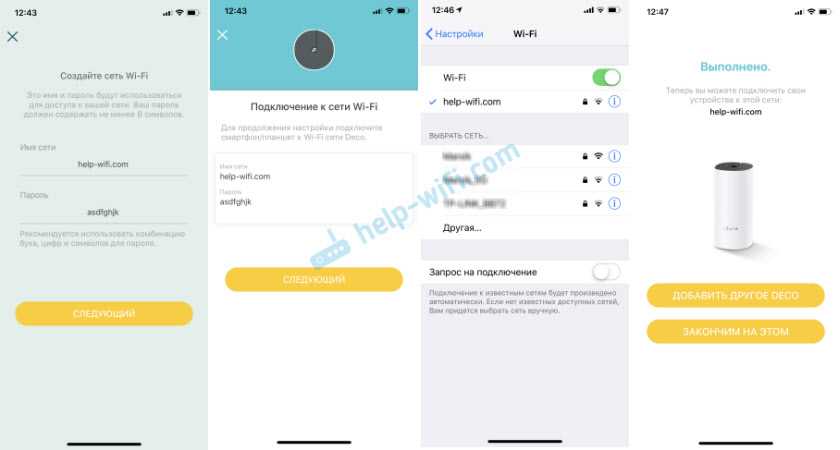 Следующий шаг – настройка Wi-Fi сети. Нужно придумать имя сети и пароль, указать их в соответствующих полях и продолжить настройку. Когда появится сообщение: «Для продолжения настройки подключите смартфон/планшет к Wi-Fi сети Deco», то зайдите в настройки Wi-Fi на своем устройстве и выполните подключение к сети, которую только что создали. Используя установленный пароль.