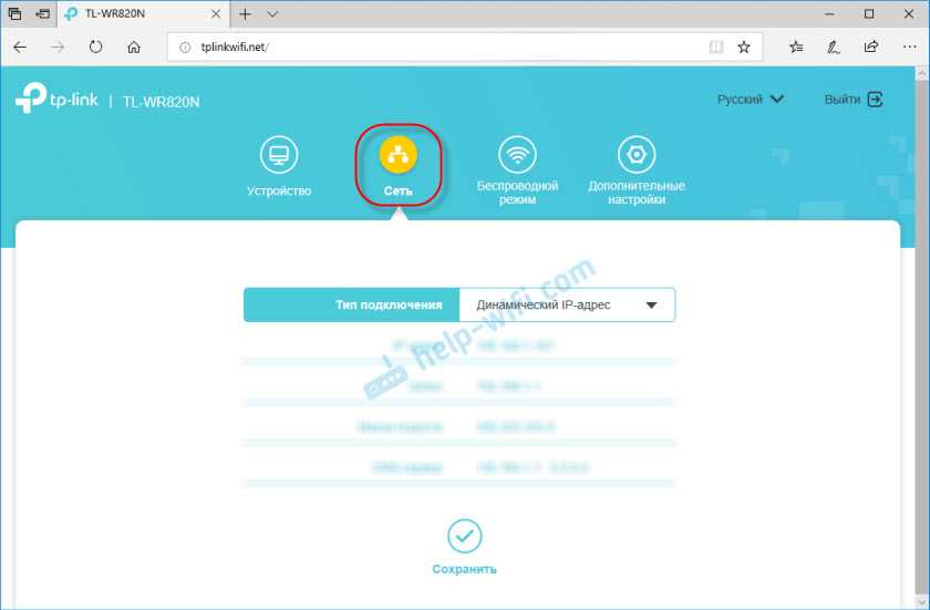 На вкладке «Сеть» можно изменить основные настройки подключения к интернету.