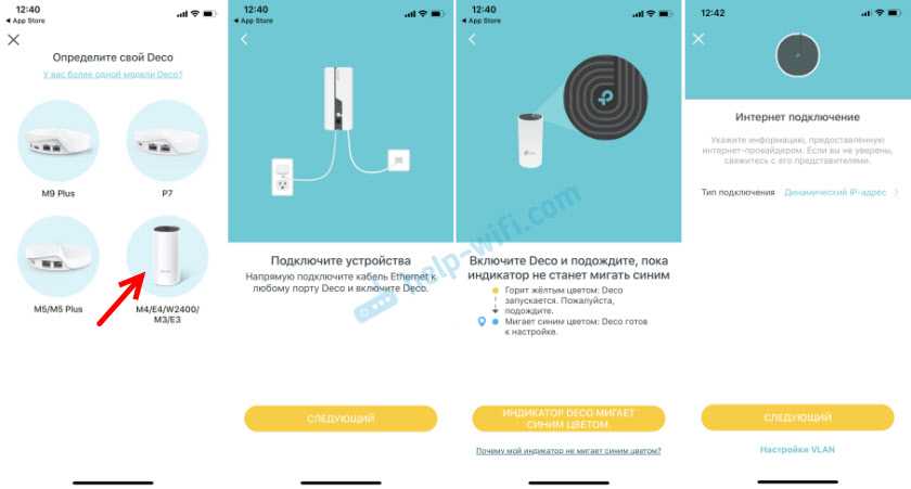 Не закрывая приложение перейдите в настройки своего мобильного устройства и подключите его к открытой Wi-Fi сети, которую транслирует модуль Deco M4. Имя сети (SSID) указано снизу модуля. После подключения вернитесь в приложение Deco и нажмите на кнопку «Приступим».