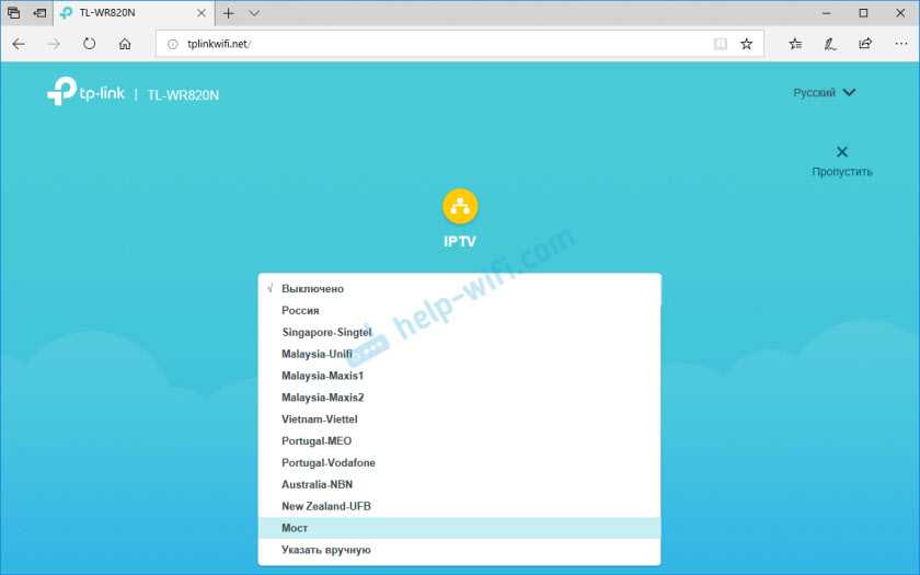 Если же «Динамический IP-адрес», то ничего вводить не нужно. Роутер предложит настроить IPTV. Если ваш провайдер предоставляет услугу цифрового телевидения, то можете задать необходимые параметры. Можно выбрать страну для автоматической настройки, настроить мост (указать LAN порт (1, или оба) куда будет подключена IPTV приставка), или же прописать все настройки вручную (VLAN ID). Подробнее о настройке IPTV на TP-Link TL-WR820N можно почитать в статье настройка IPTV на роутерах TP-Link.