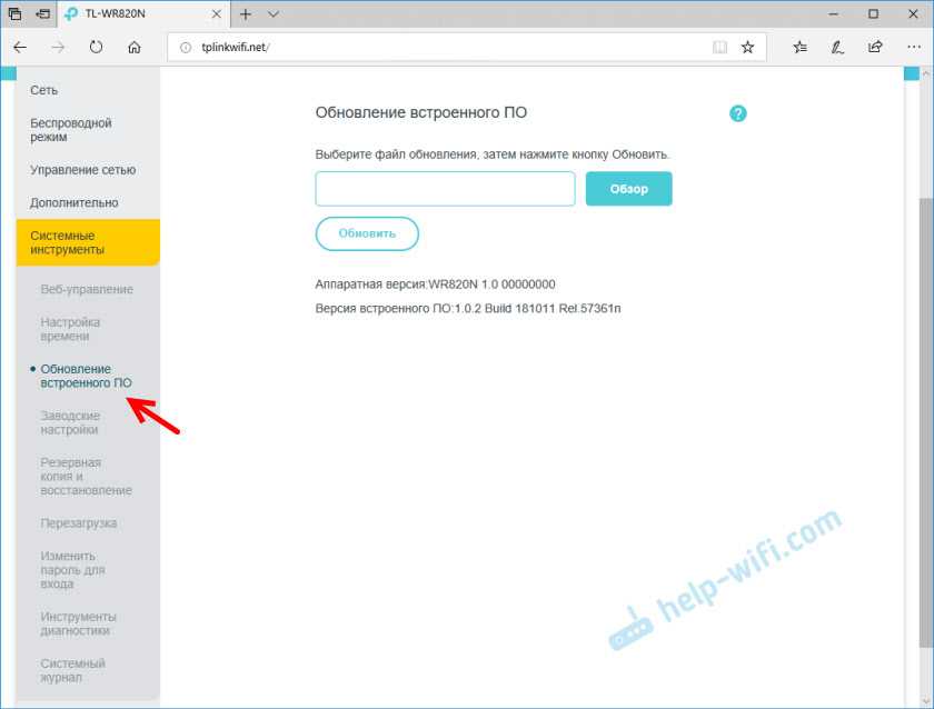 В разделе «Системные инструменты», например, можно обновить прошивку TP-Link TL-WR820N. Для этого скачайте с сайта TP-Link новую версию прошивки строго для этой модели и аппаратной версии (которая указана на наклейке снизу роутера), и обновите ее на вкладке «Обновление встроенного ПО».