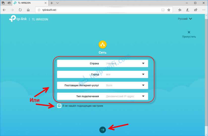 На первом этапе можно попробовать выбрать свою страну, город, интернет-провайдера и тип подключения. Если нужных настроек вы не найдете, то поставьте галочку возле «Я не нашел подходящих настроек».