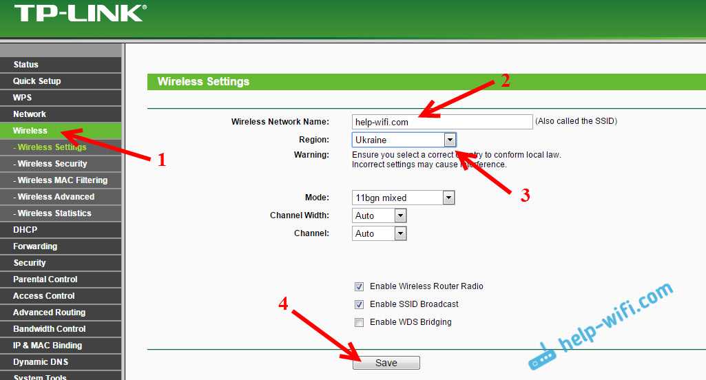 Для настройки беспроводной сети перейдите на вкладку Wireless (Беспроводной режим). Там нам нужно сменить имя Wi-Fi сети (Wireless Network Name), указать наш регион, и сохранить настройки нажав на кнопку Save.