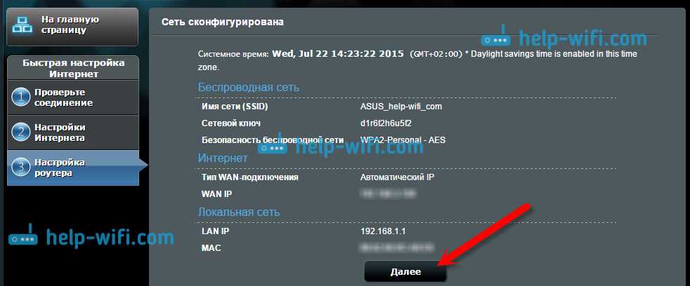 Так как у меня интернет-провайдер использует тип подключения Динамический IP-адрес (DHCP), то дополнительно настройки вводить не нужно. Роутер сразу подключился к интернету. Я просто нажимаю «Далее».