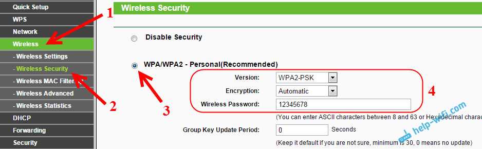 Выбираем пункт WPA/WPA2 — Personal(Recommended). Выставляем Version и Encryption как у меня на скриншоте ниже, и в поле Wireless Password (Пароль беспроводной сети) указываем пароль, которым будет защищена ваша сеть. Минимум 8 символов.