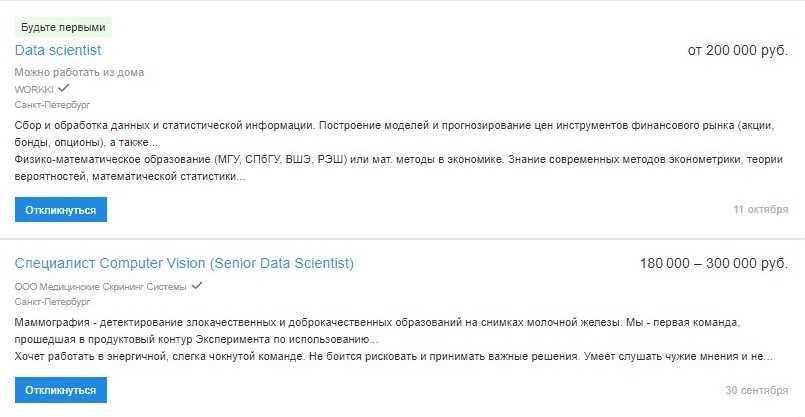 Самые лучшие условия по оплате предлагают на должности Senior Data Scientist – до 400 000 рублей. Получить работу может кандидат, знающий Python, Numpy, Scipy, Pandas, Matplotlib, SQL и имеющий опыт более трех лет.