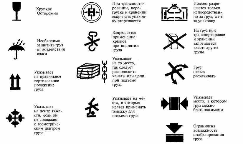 В соответствии с требованиями ГОСТа 14192-77 на упаковку с ломкими предметами наносятся специальные значки, а также делают отметки, указывающие на особенности изделий, например, знак, запрещающий укладывать груз штабелями.