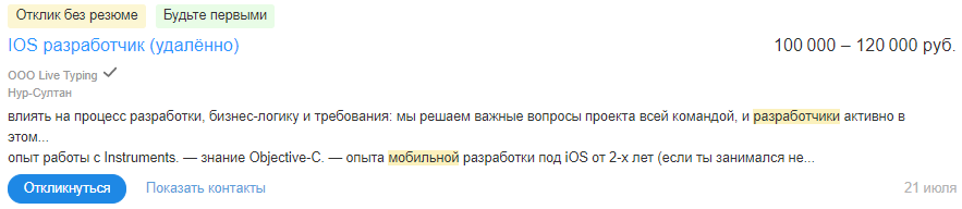 Информацию о том, сколько зарабатывают мобильные разработчики в Казахстане, мы нашли на сайте HeadHunter. Например, программист с опытом коммерческой iOS/Android-разработки от 3 лет может получать от 100 000 до 200 000 рублей в месяц.